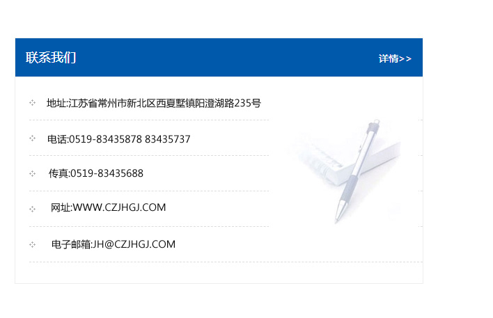 傳真:0519-83435688    郵編:213135    網(wǎng)址:WWW.czjhgj_com.5blw.com    電子郵箱:JH@czjhgj_com.5blw.com